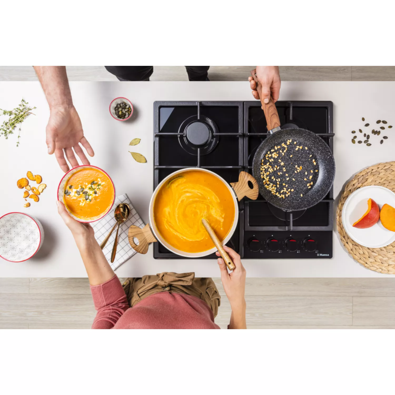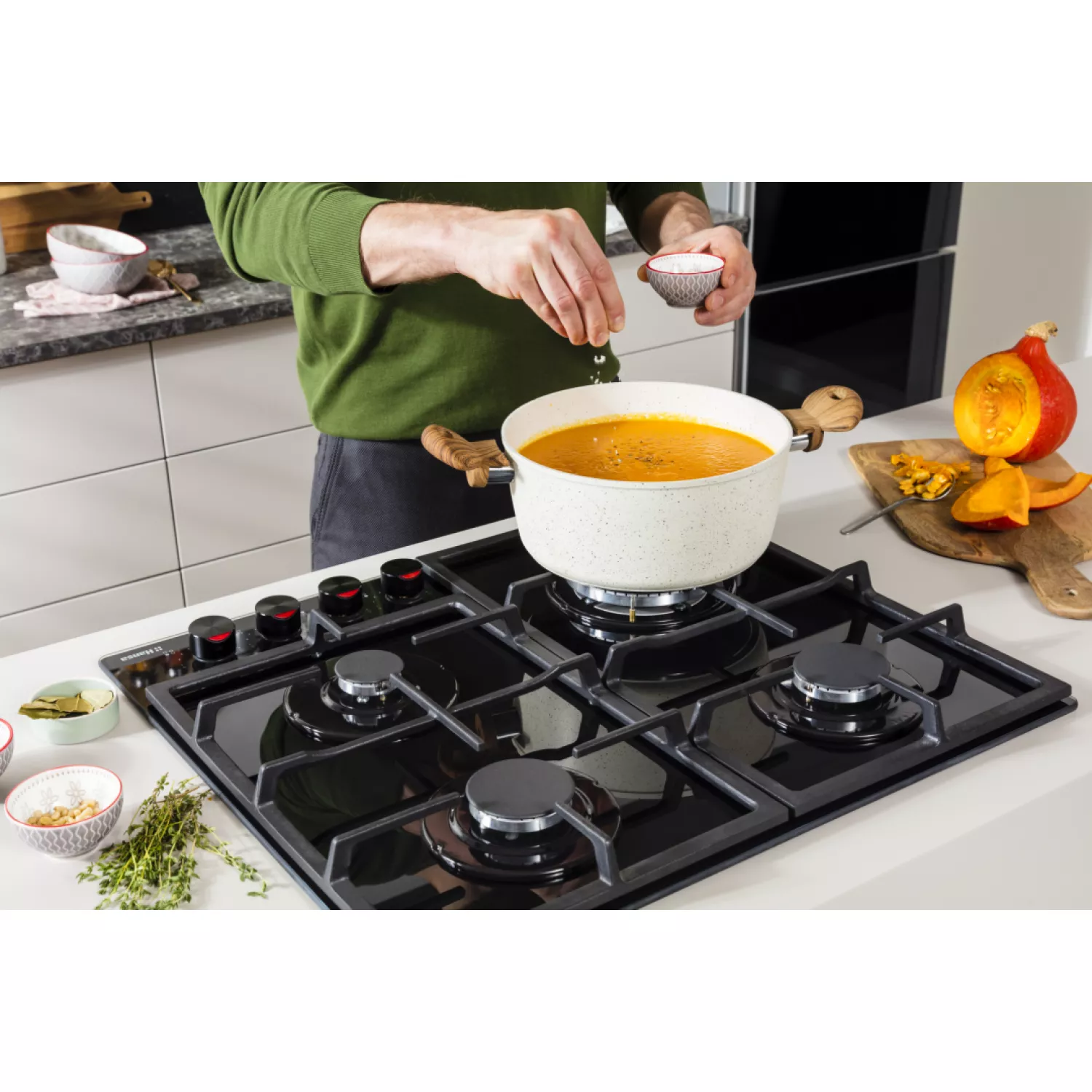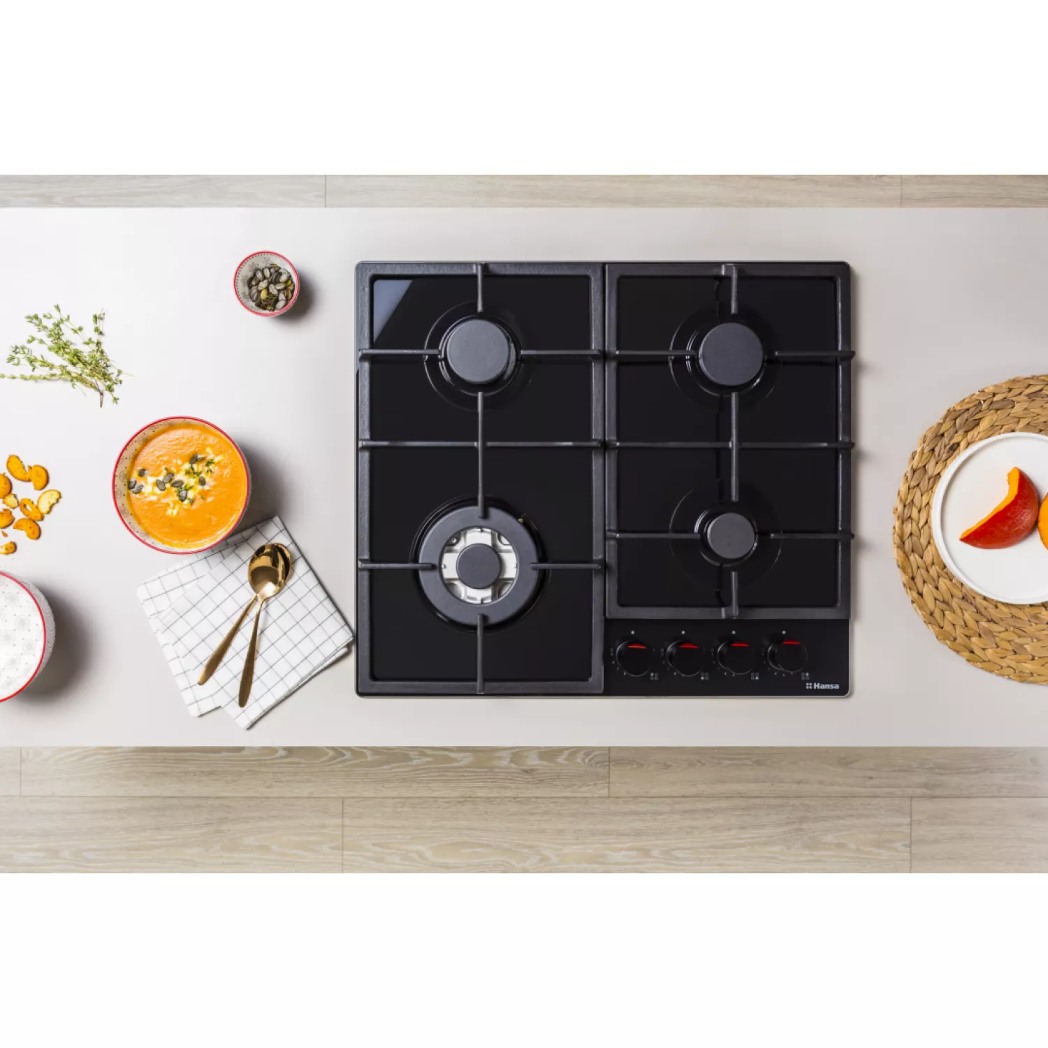 Варочная газовая панель hansa bhks631540, 4 конфорки, конфорка wok, закаленное стекло, механическое управление, черный