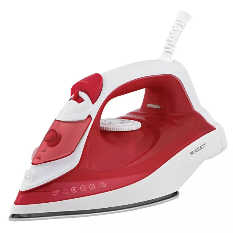 Характеристики для Утюг SCARLETT SC-SI30P18, Тефлоновая антипригарная подошва, 2400 Вт, Паровой удар 140 г, мин, 280 мл, Красный, Белый