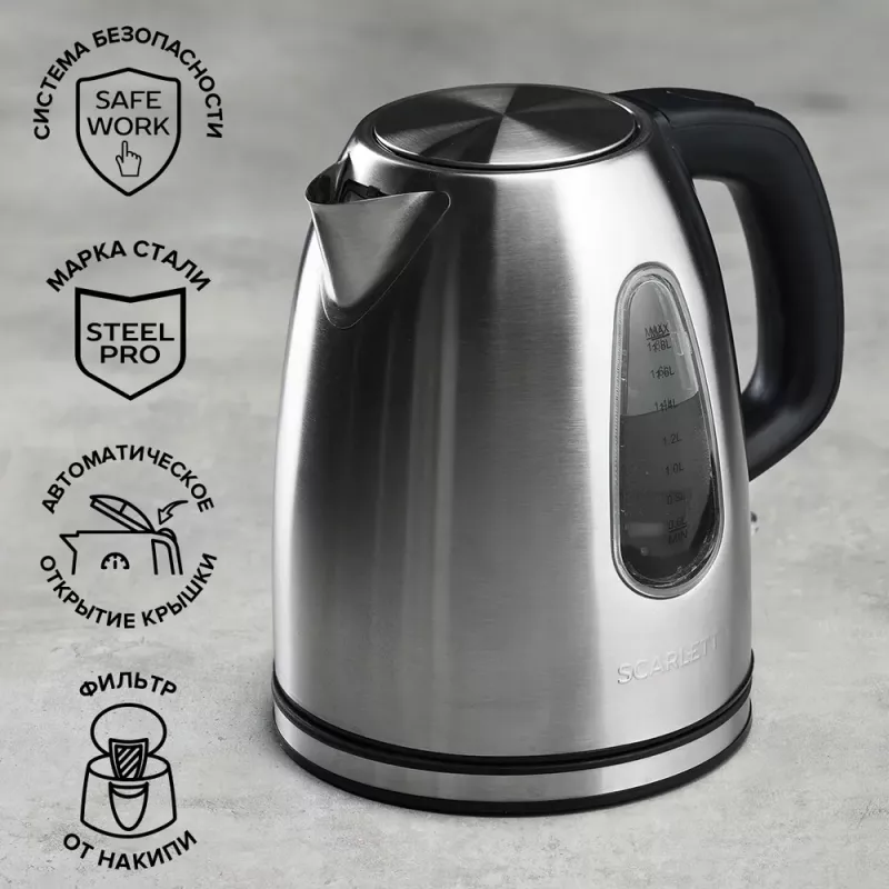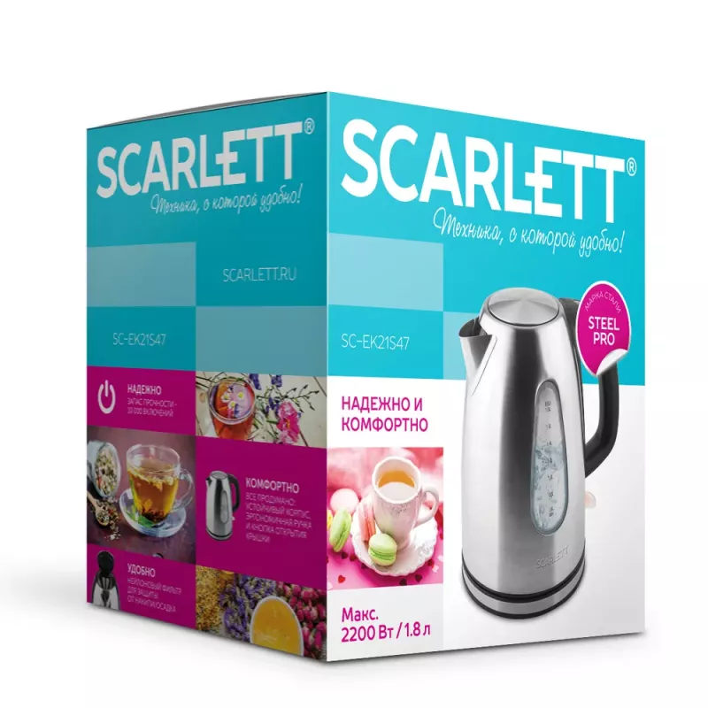 Характеристики для Электрочайник SCARLETT SCEK21S47, 1.8 л, 2200 Вт, Нержавеющая сталь