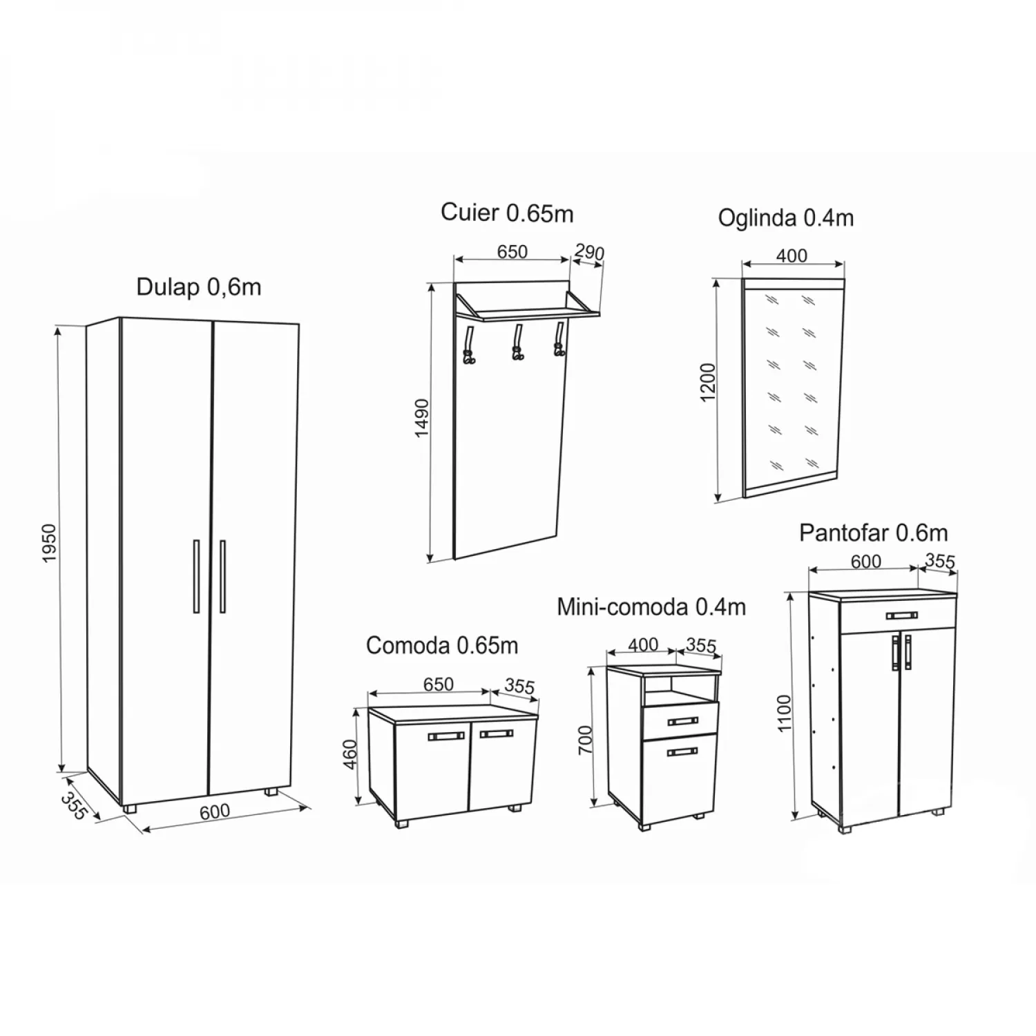 | В комплект входит комод 0.65м, вешалка, комод 0.4м, тумба для обуви и шкаф 0.6м |
