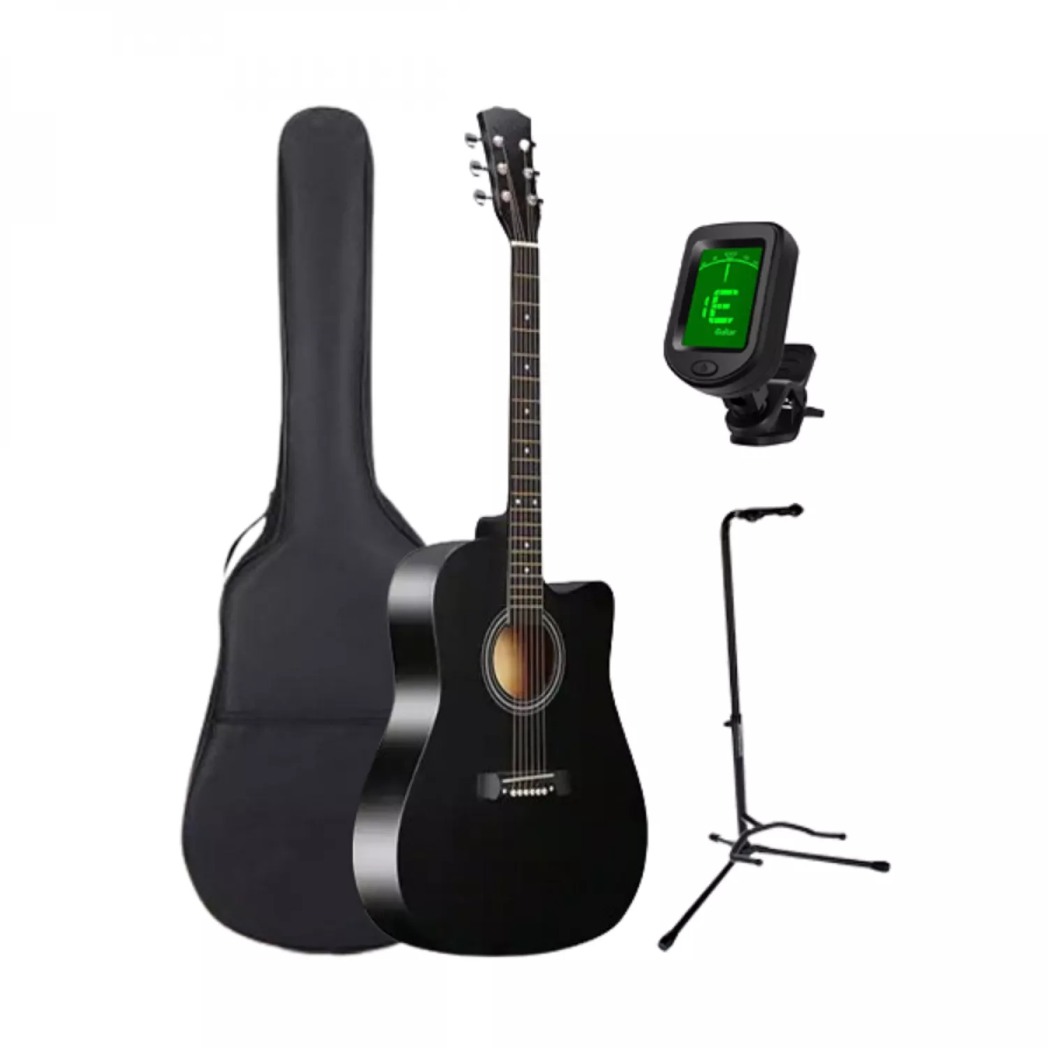 В комплект входит гитара, футляр, подставка для гитары и тюнер
