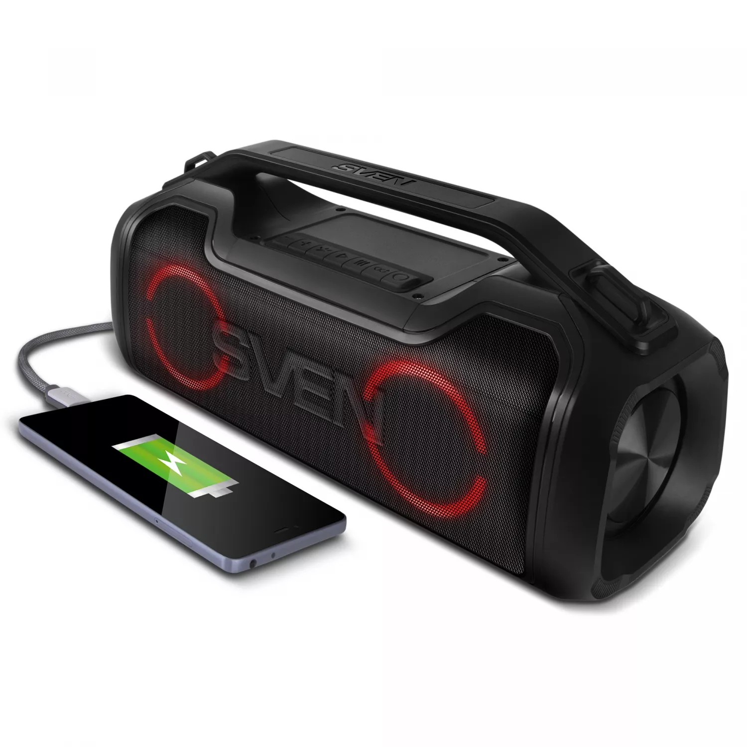 SVEN PS-390 Black, Bluetooth Portable Speaker, Waterproof (IPx5), Dynamic switchable RGB backlight, 50W RMS, MicroSD, FM tuner, USB Type-C, TWS, built-in lithium battery - 3600 mAh, Power Bank function, AUX stereo input