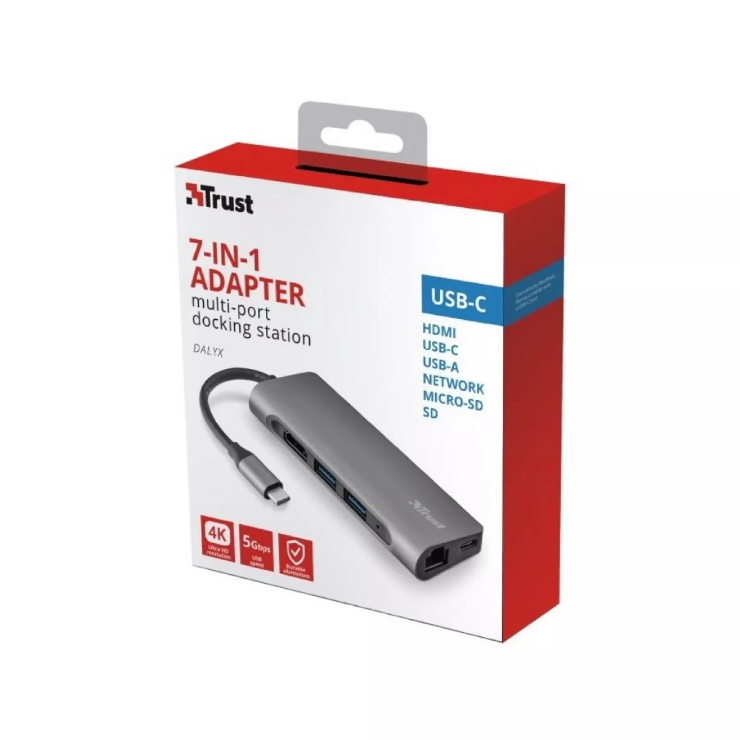 Характеристики для Док-станция TRUST DALYX 7-IN-1 USB-C MULTIPORT ADAPTER, HDMI 1.4 (4K 30HZ), NETWORK PORT WITH SUPPORT FOR FAST GIGABIT ETHERNET, USB-C, 2 X USB-A, SD, MICROSD, 57G