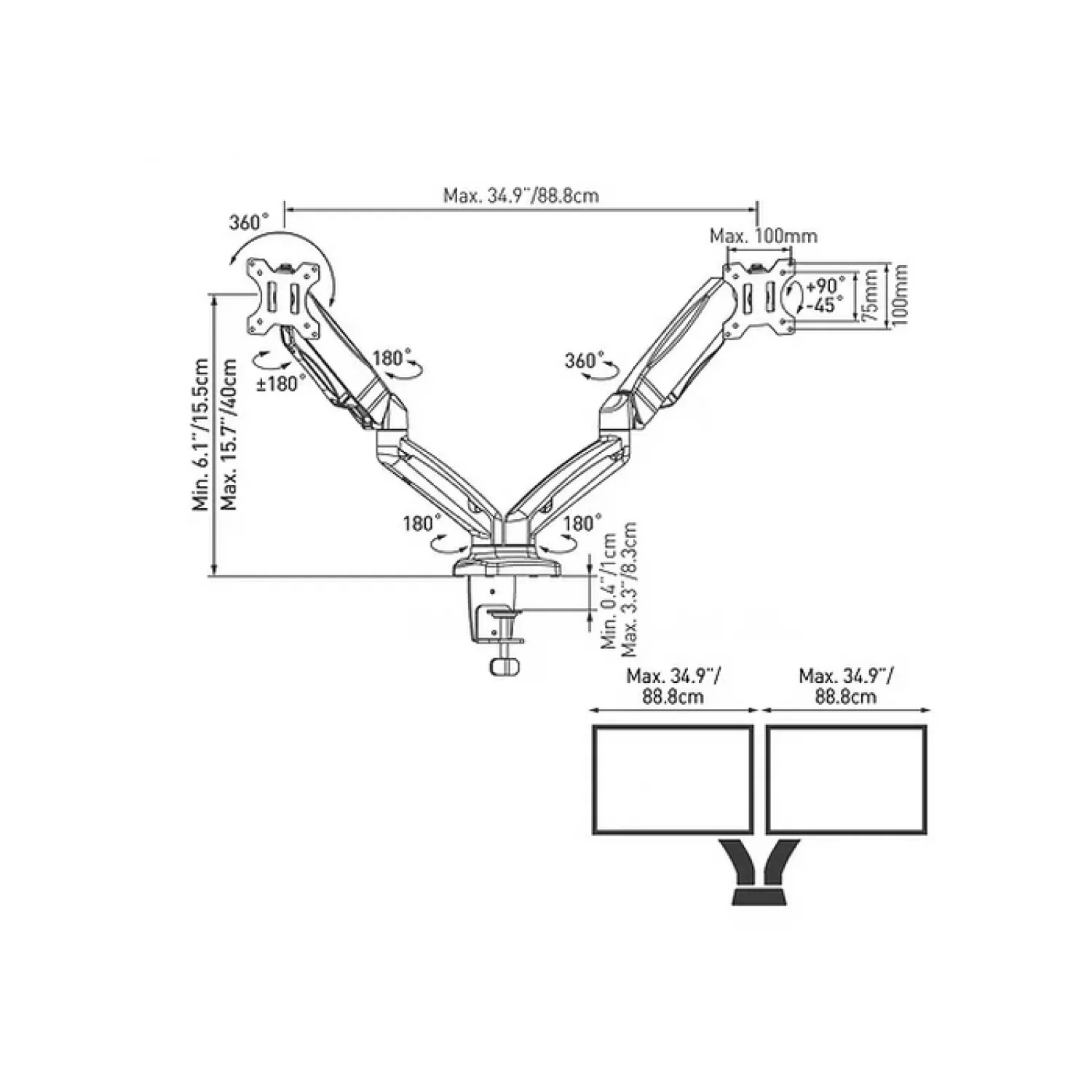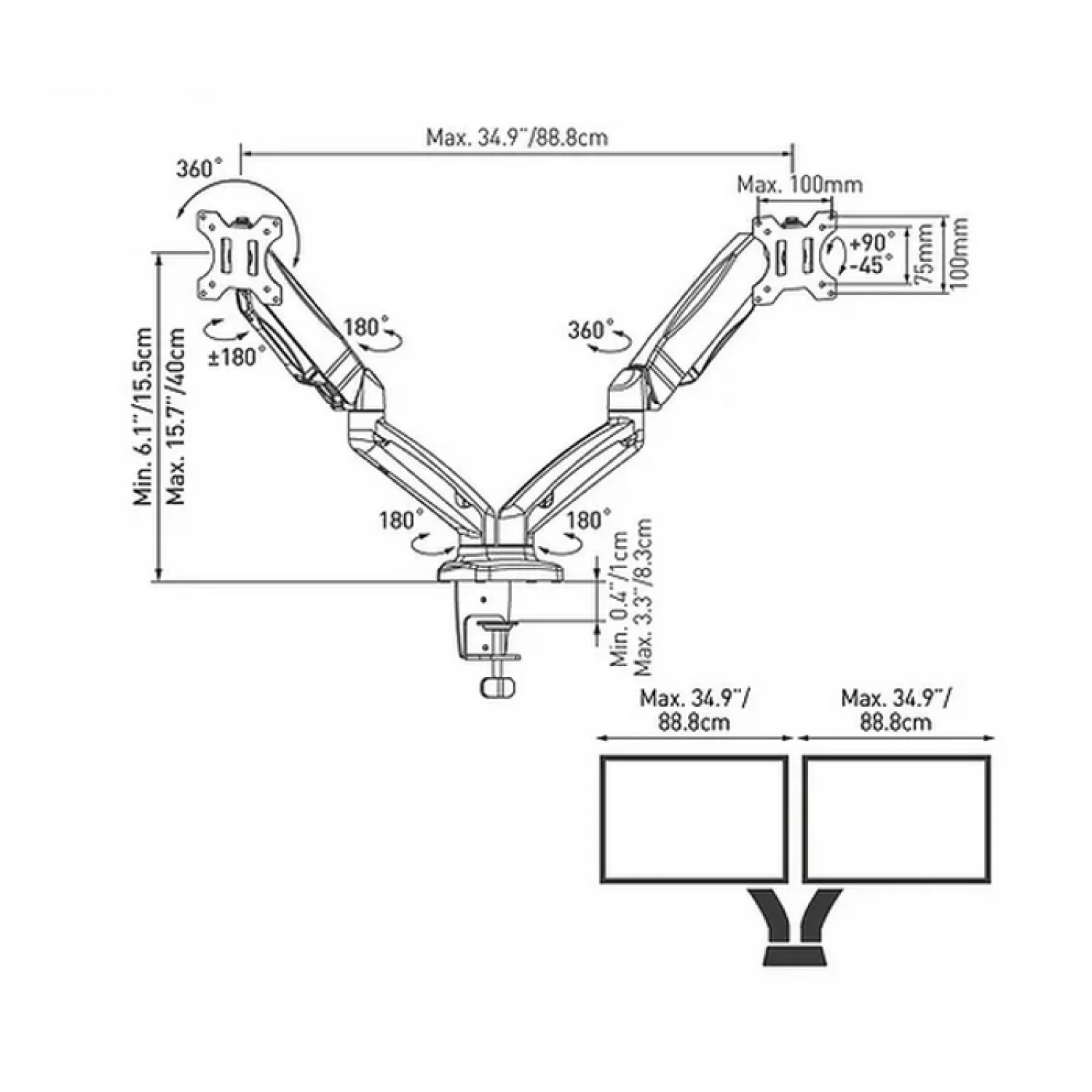 Крепление обеспечивает широкий диапазон движений, позволяя настроить экраны под индивидуальные предпочтения пользователя. Возможна регулировка высоты, поворот на 360°, складывание на 360°, разворот пластины крепления экрана на 180°, а также поворот экрана для горизонтальной или вертикальной ориентации. Дополнительно предусмотрен инструментально-независимый наклон от -90° до 90°.