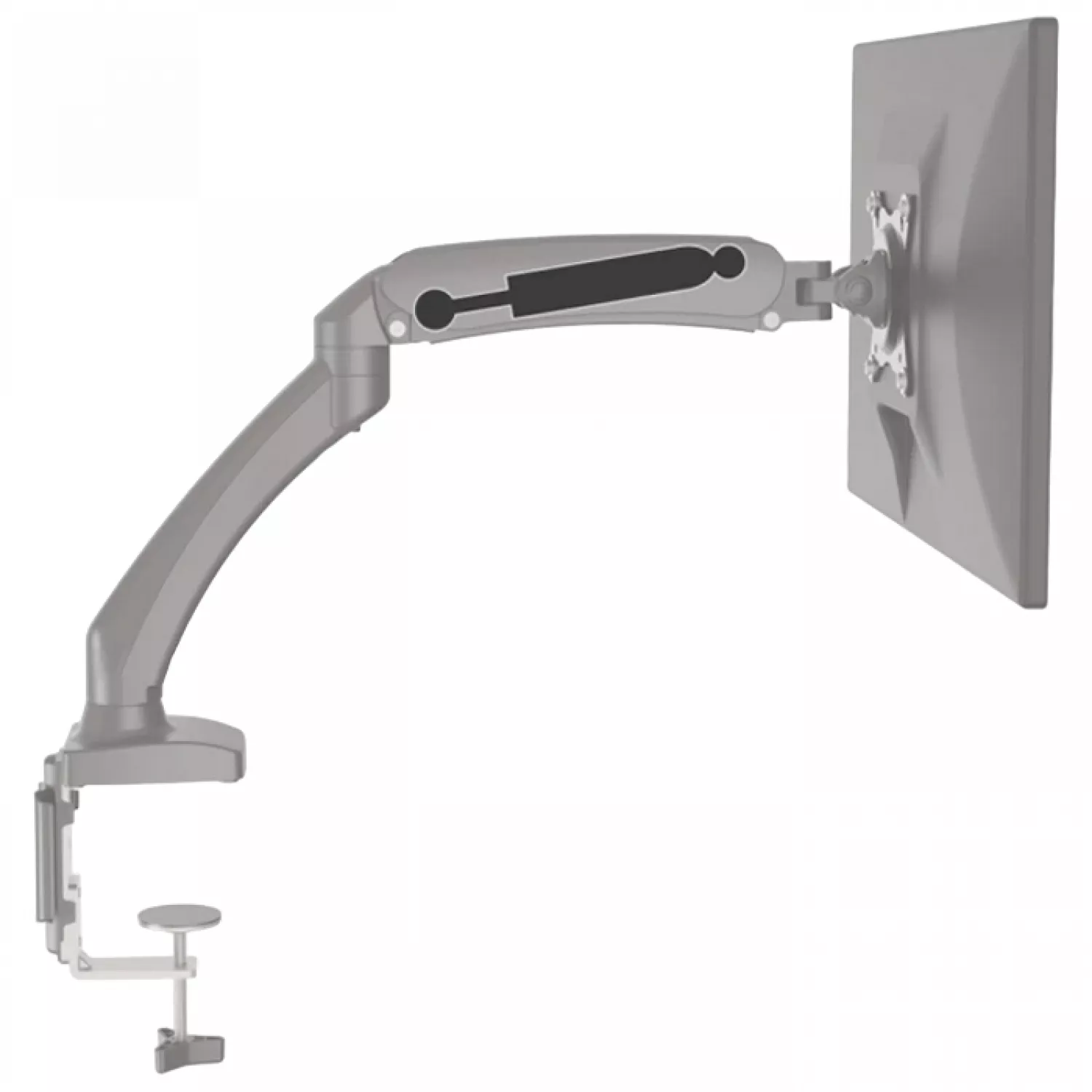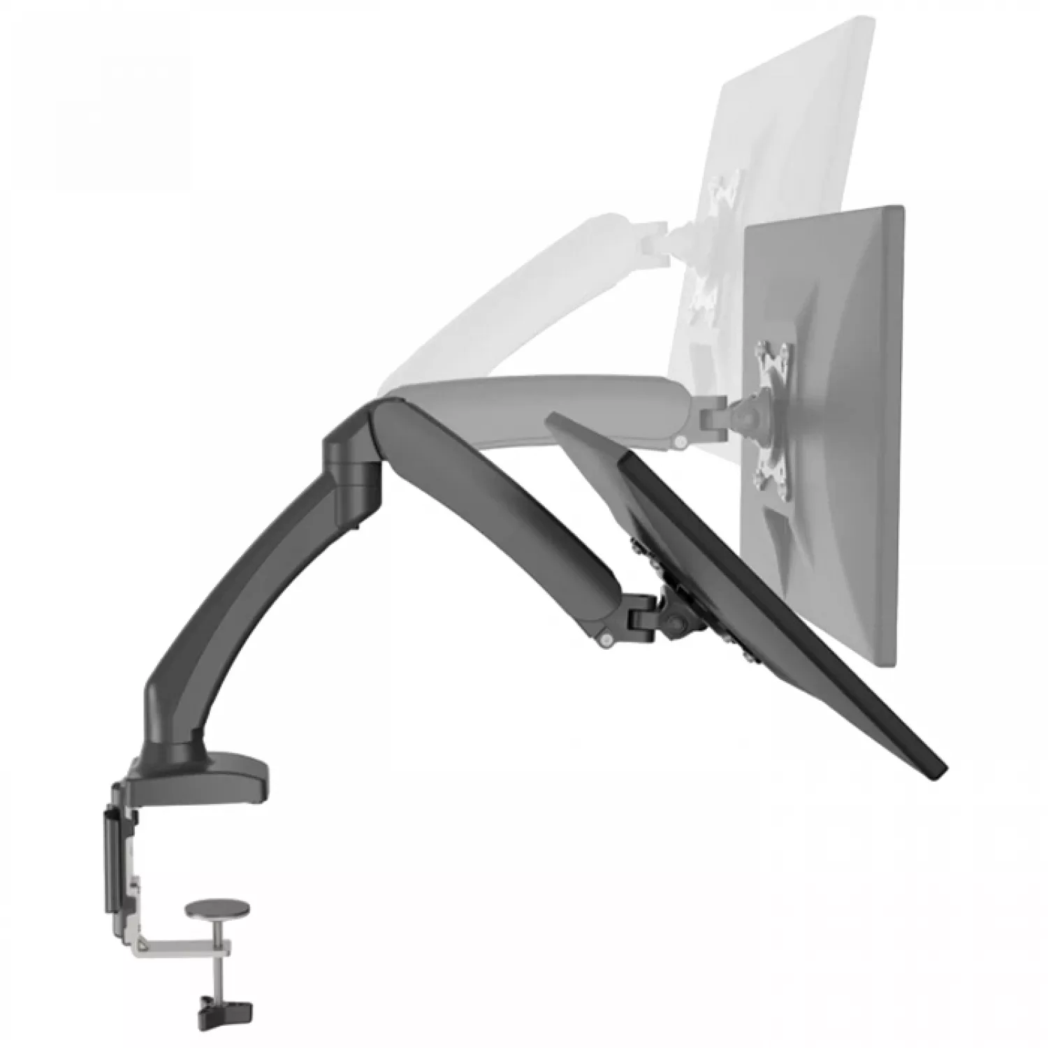 Держатель поддерживает пять основных движений: регулировку высоты, поворот, складывание, разворот и наклон. Благодаря газовому пружинному механизму высота регулируется плавно и без усилий. Минимальная высота от центра крепления экрана до стола составляет 16.5 см, а максимальная достигает 41.5 см, что позволяет легко настроить оптимальное положение для комфортной работы.
