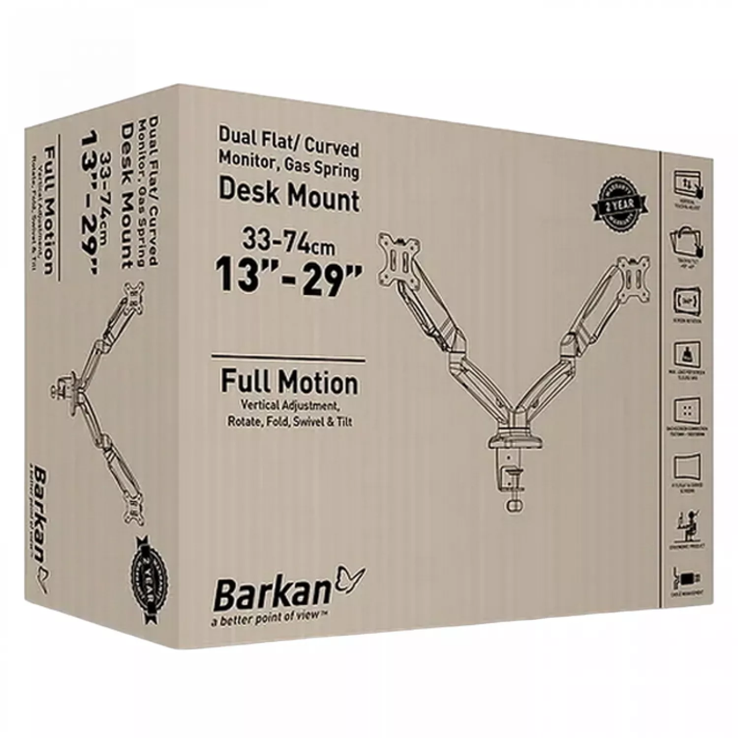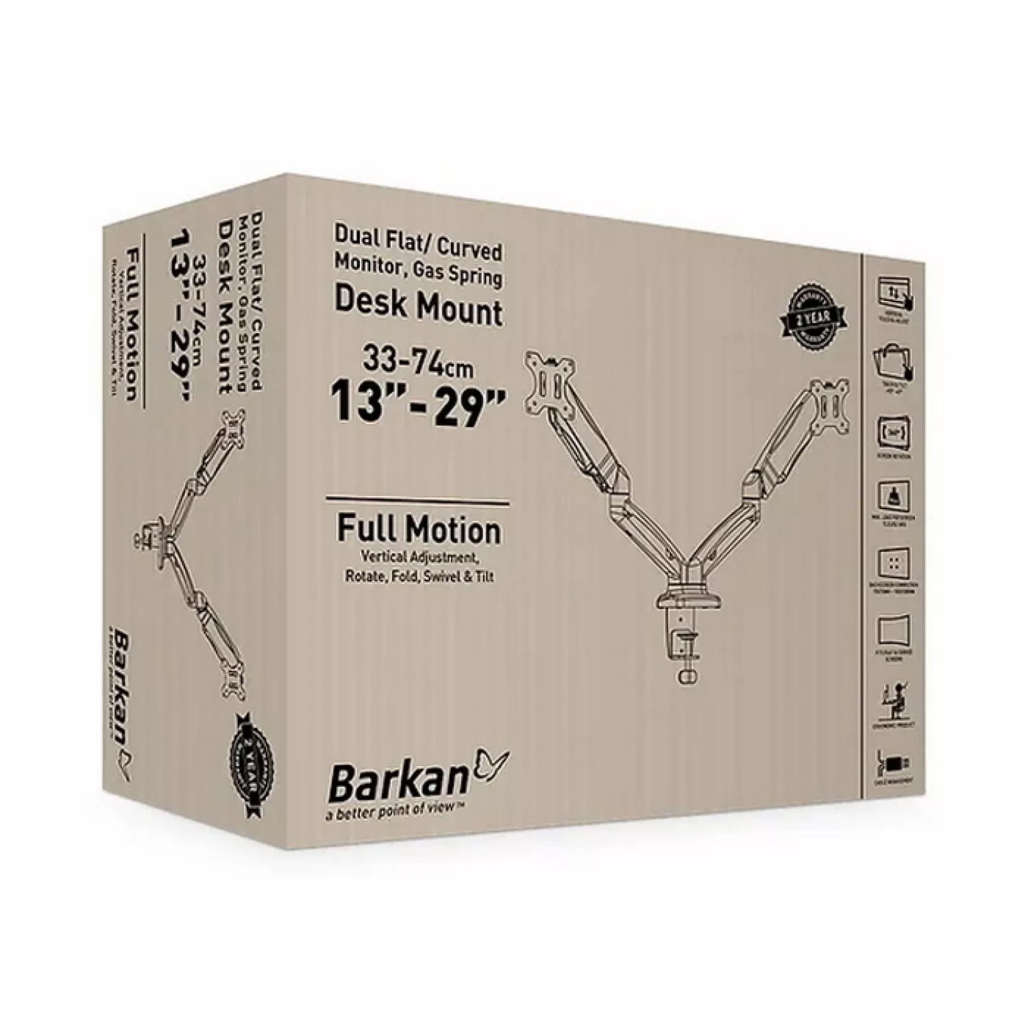 Настольный держатель для двух мониторов Barkan M142P обеспечивает прочное и безопасное крепление экранов. Конструкция рассчитана на мониторы весом до 9 кг (19.8 lbs) каждый, а также прошла тестирование с нагрузкой до 18 кг (40 lbs) на каждую руку.