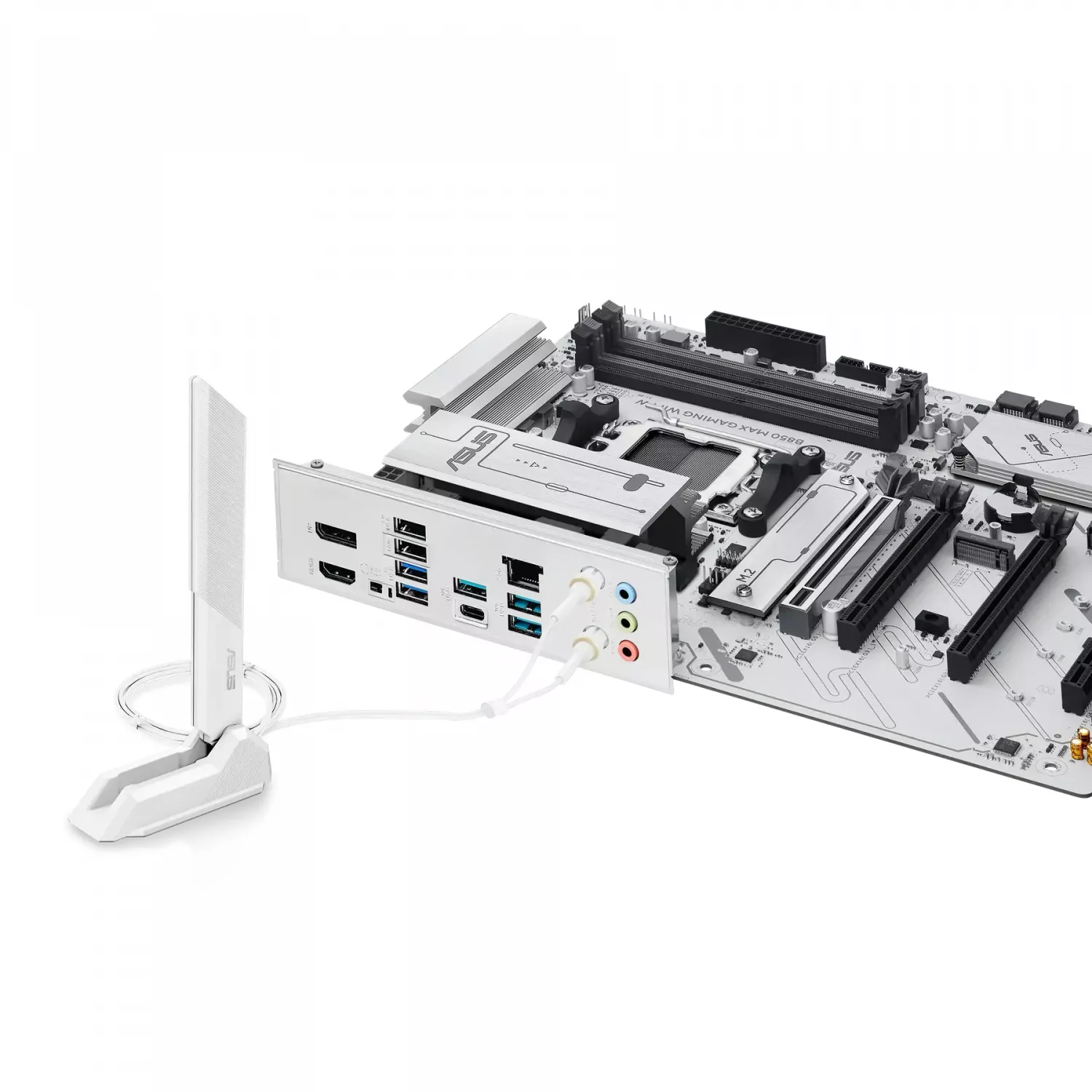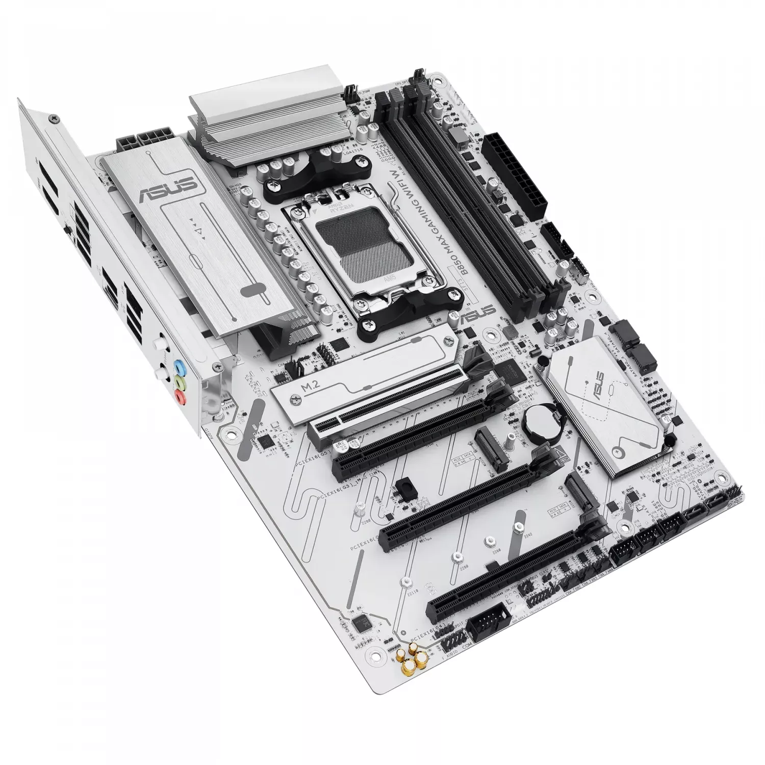 ASUS B850 MAX GAMING WIFI W имеет встроенный модуль Wi-Fi и Bluetooth, что позволяет легко подключать периферию и использовать беспроводные сети без дополнительных адаптеров. Набор портов расширения включает M.2 слоты для SSD, поддержку USB 3.2 и PCIe слоты для видеокарт, обеспечивая гибкость сборки под любые задачи — от игр до творческой работы.