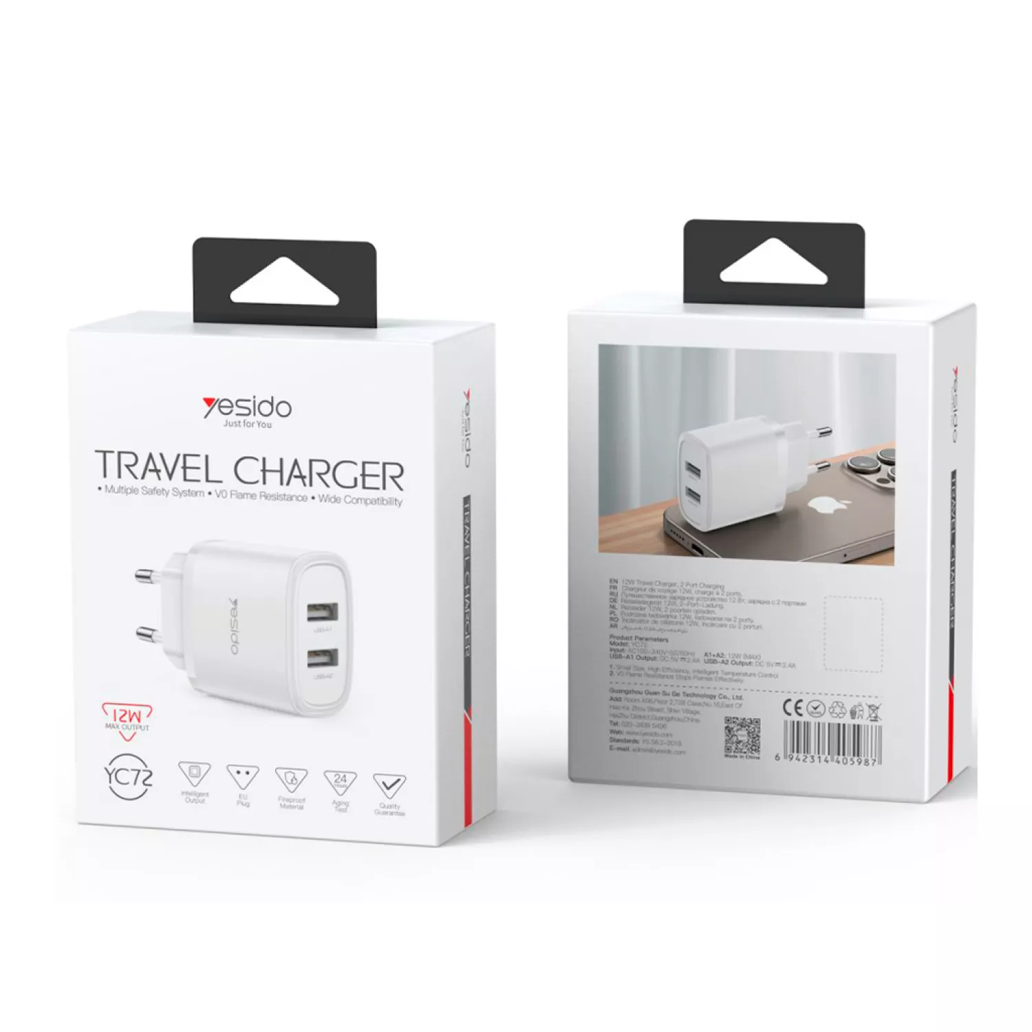 Yesido Wall Charger 2*USB-A 24W Max YC72, White YC72WH YC72WH |