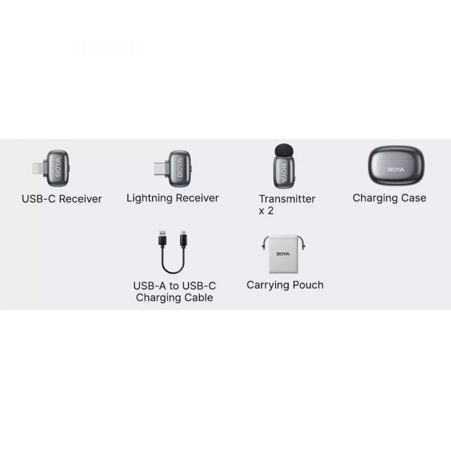 Характеристики для Микрофон Wireless Boya Microphone Wireless Boya Mini 2-01 Ultracompact (2 TX+ 2RX USB-C plug+ Lightning Plug + Charging case), Space Gray