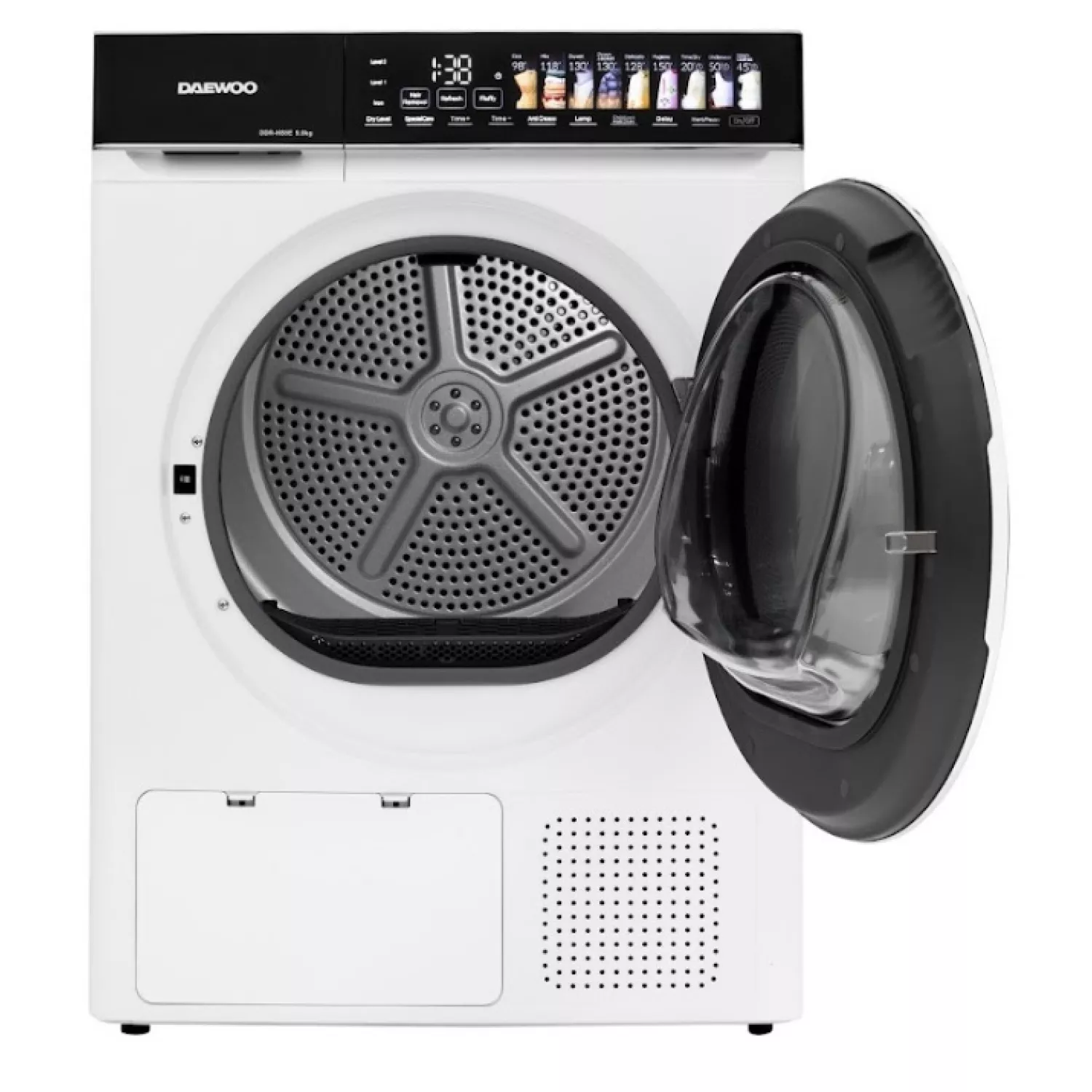 Стиральная машина daewoo uscator de rufe daewoo ddr-hs9e-1, 9 kg, clasa e, control electronic, pompa de caldura, butoane touch, panou de control negru cu pictograme mari colorate, usa dubla neagra cu inel cromat, culoare alb