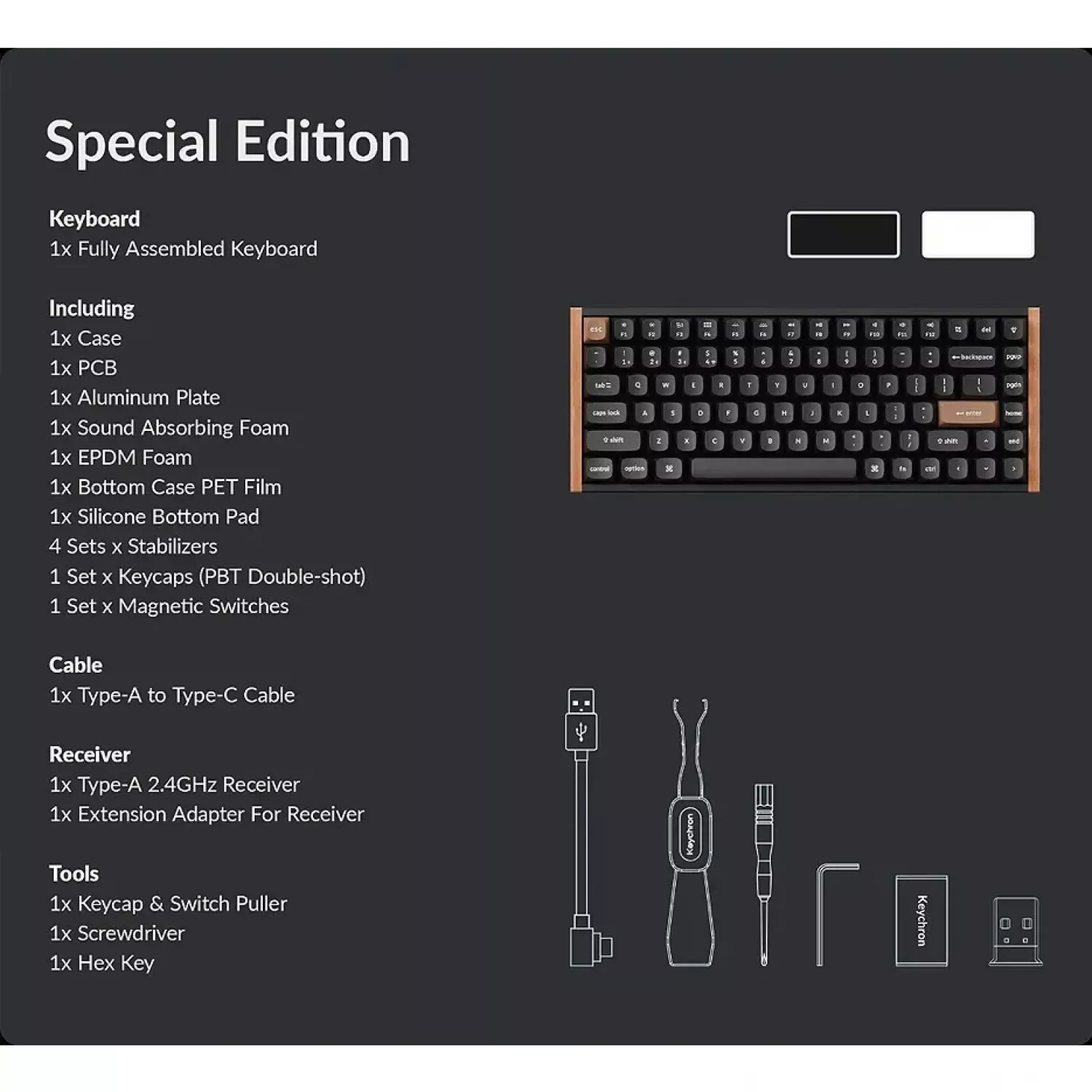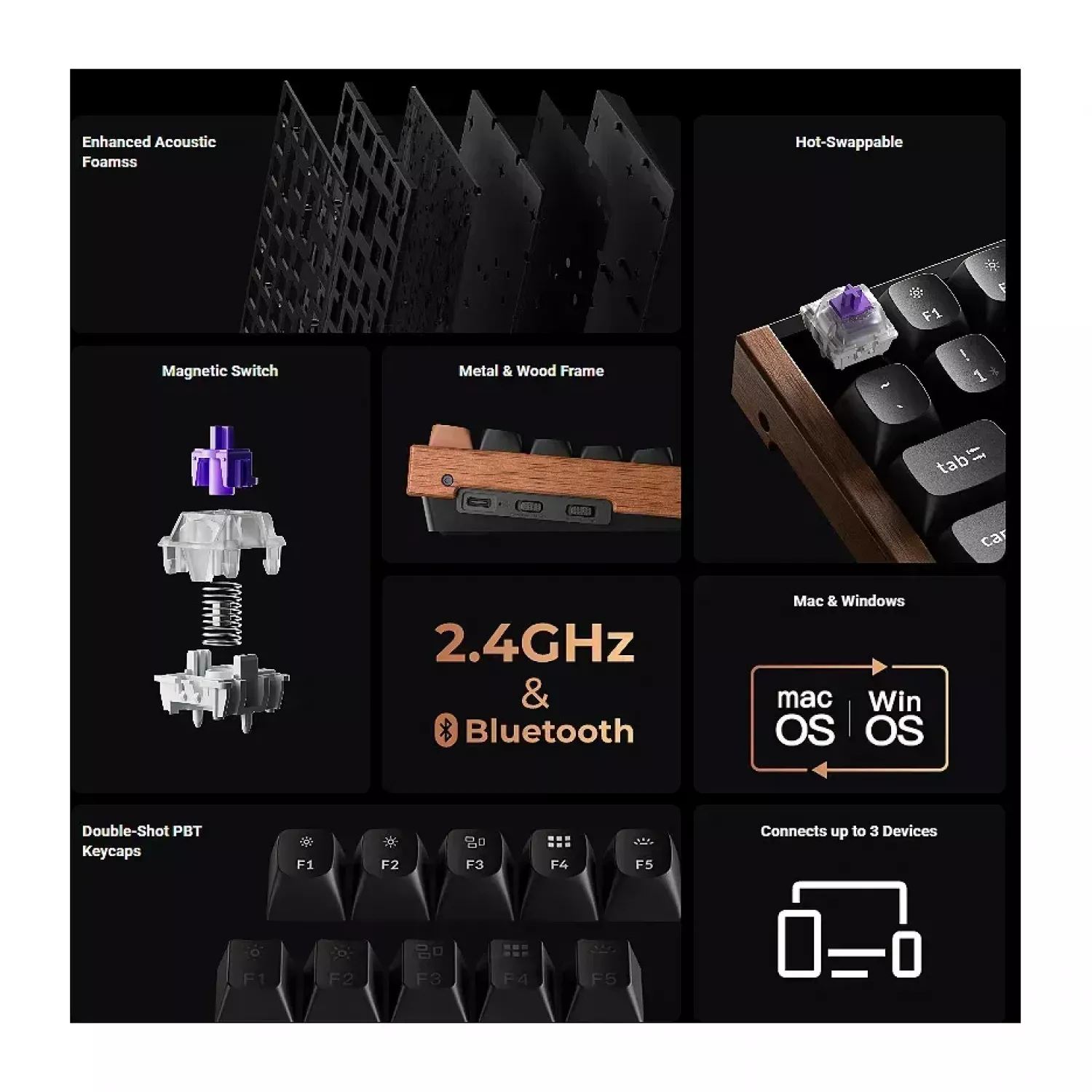 Характеристики для Клавиатура Keychron Keychron K2 HE QMK Wireless Magnetic Switch Custom Keyboard Russian Layout (K2H-F1-RU), SE Aluminum+Wood Frame, 75% layout, RGB Backlight, Gateron Double-Rail Magnetic Nebula Switch, Hot-Swap, 2.4GHz&Bluetooth, USB Type-C, gamer (tastatura/клавиатура