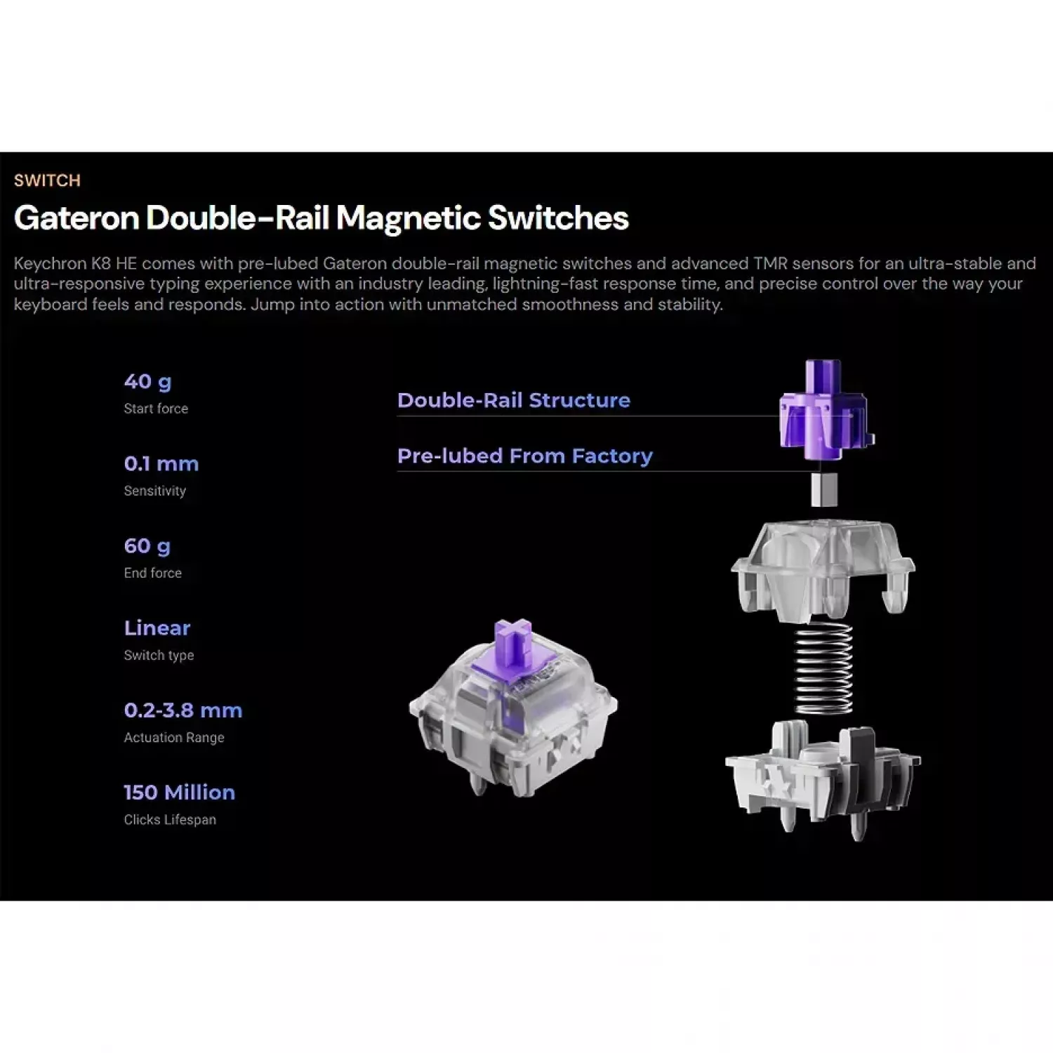 Характеристики для Клавиатура Keychron Keychron K8 HE QMK Wireless Magnetic Switch Custom Keyboard (K8H-F1), Special Edition Aluminum + Wood Frame, 80% TKL layout, RGB Backlight, Gateron Double-Rail Magnetic Nebula Switch, Hot-Swap, 2.4GHz&Bluetooth, USB Type-C, gamer (tastatura/клавиатур