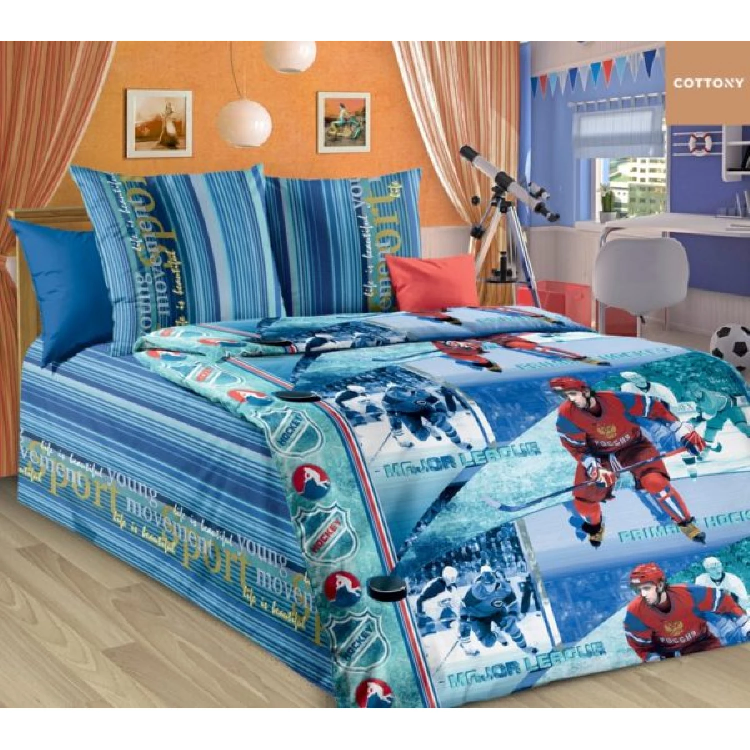 Постельное белье (комплект) cottony hokey, полуторный, хлопок, синий