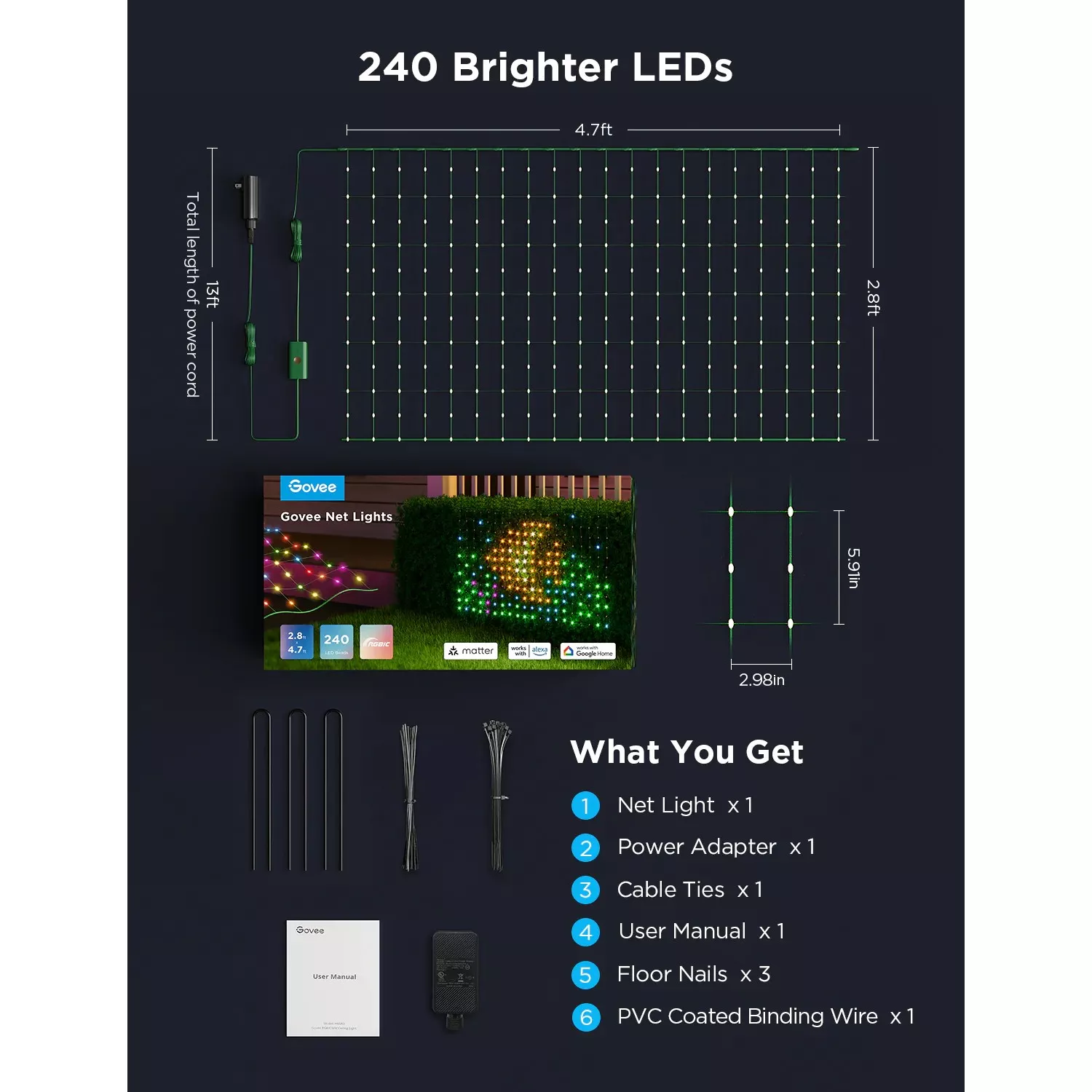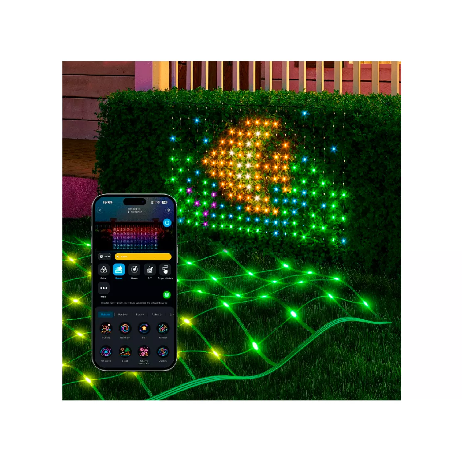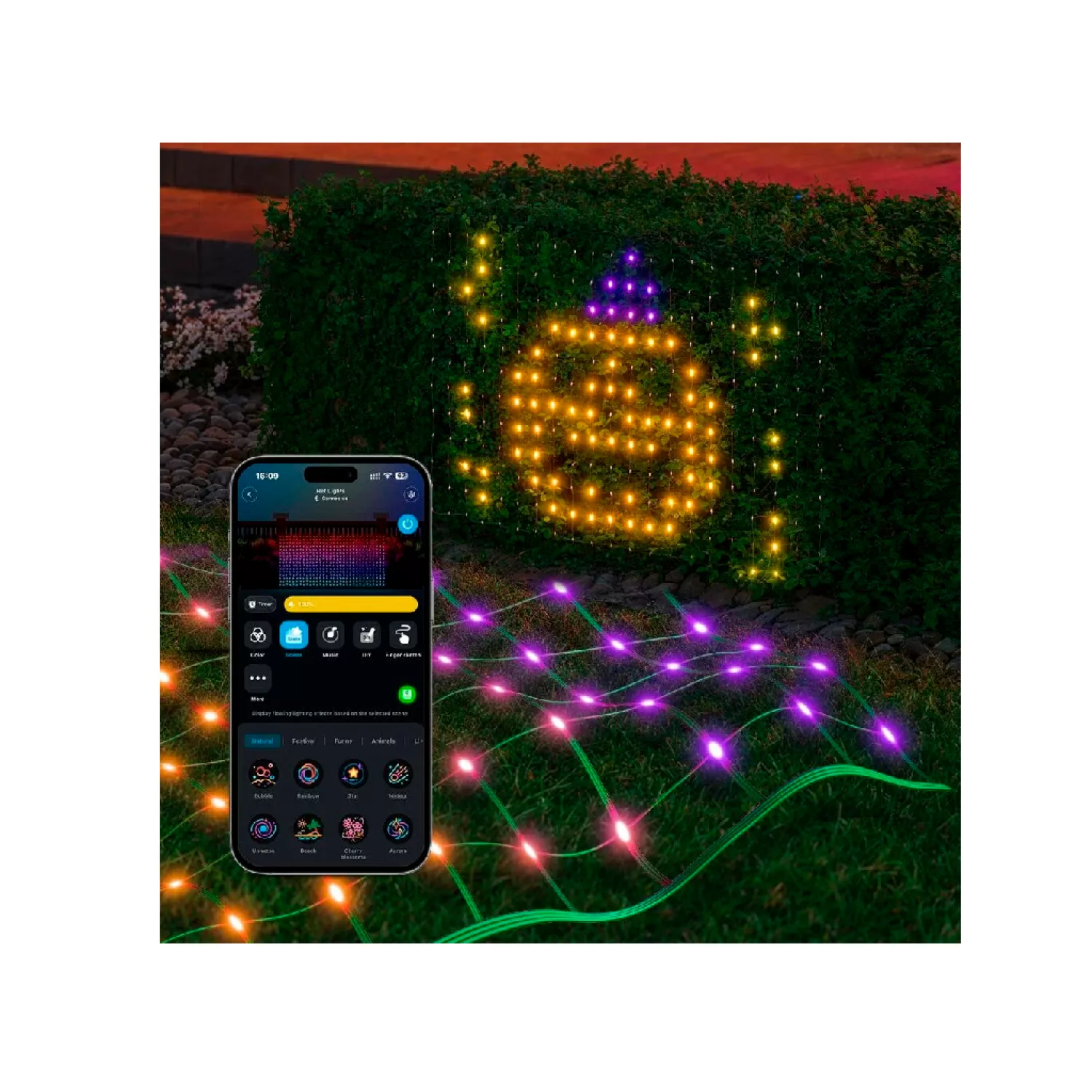 умный наружный светильник govee rgbic net lights 1.2*1.2m, wi-fi + bt, 240 leds, matter compatible, multiple scene modes, diy mode, ip65 waterproof, voice control, app, no hub required, operating temperature -20° to 40°