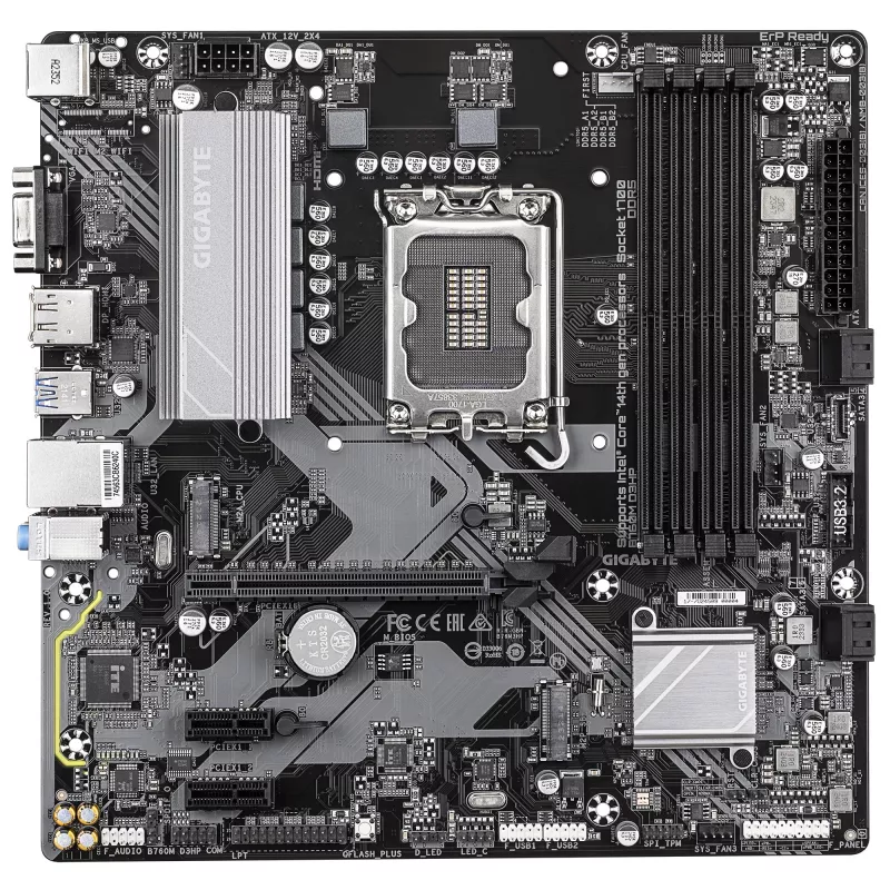 GIGABYTE B760M D3HP, Socket 1700, Intel® B760 (14/13/12th Gen CPU), 9Phases, CPU iGPU, Dual 4xDDR5-5600, VGA, HDMI, 1xDP, 1xPCIe X16, 4xSATA3, RAID, 2xM.2 4.0, 2xPCIe X1, ALC897 HDA 7.1, 1xGbE LAN, 5xUSB 3.2, RGB Fusion, mATX