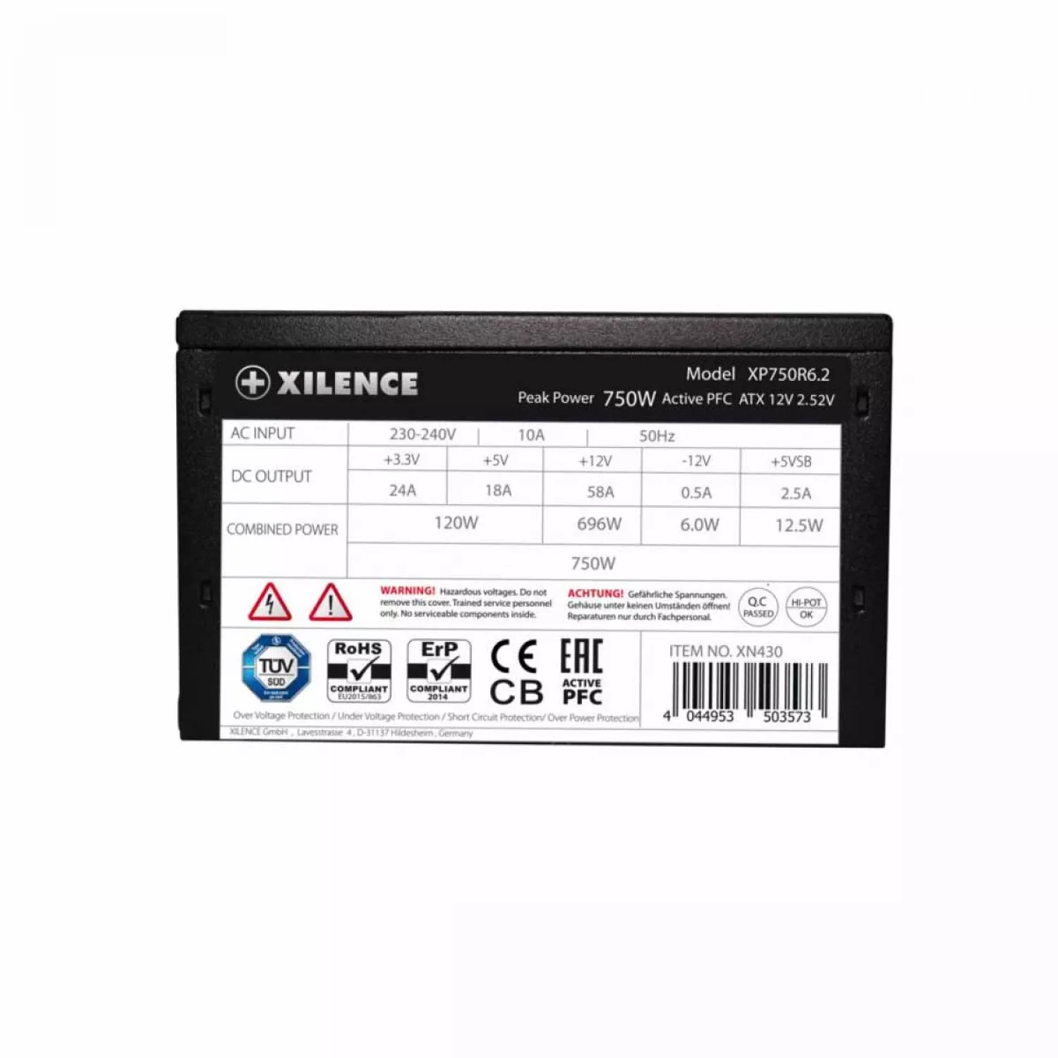 Характеристики для Блок питания ПК XILENCE XP750R6.2 (XN430), 750W, "Performance C+ Series", ATX 2.52, ErP2014 norm, 80+ Efficiency, Active PFC, 120mm fan,+12V (29A+29A), 1x 20+4 Pin (MB), 1x P8 (CPU) + P4+4 (CPU), 5x SATA, 2x PCI-E 6+2pin (GPU), 3x PATA, OVP, UVP, SCP, OLP, Black